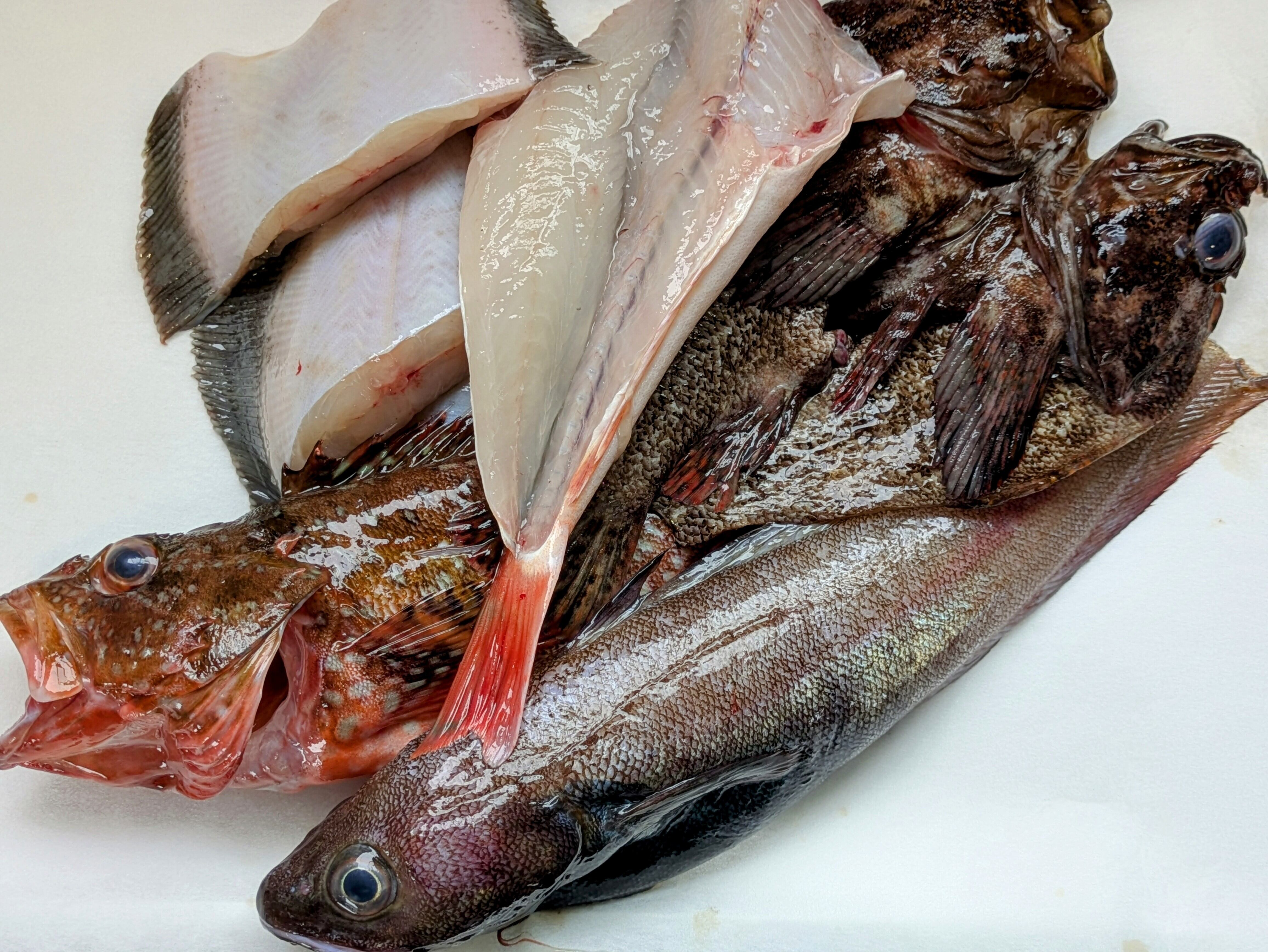 いわて北三陸、八木(やぎ)魚市場、朝どれの生の鮮魚5種。