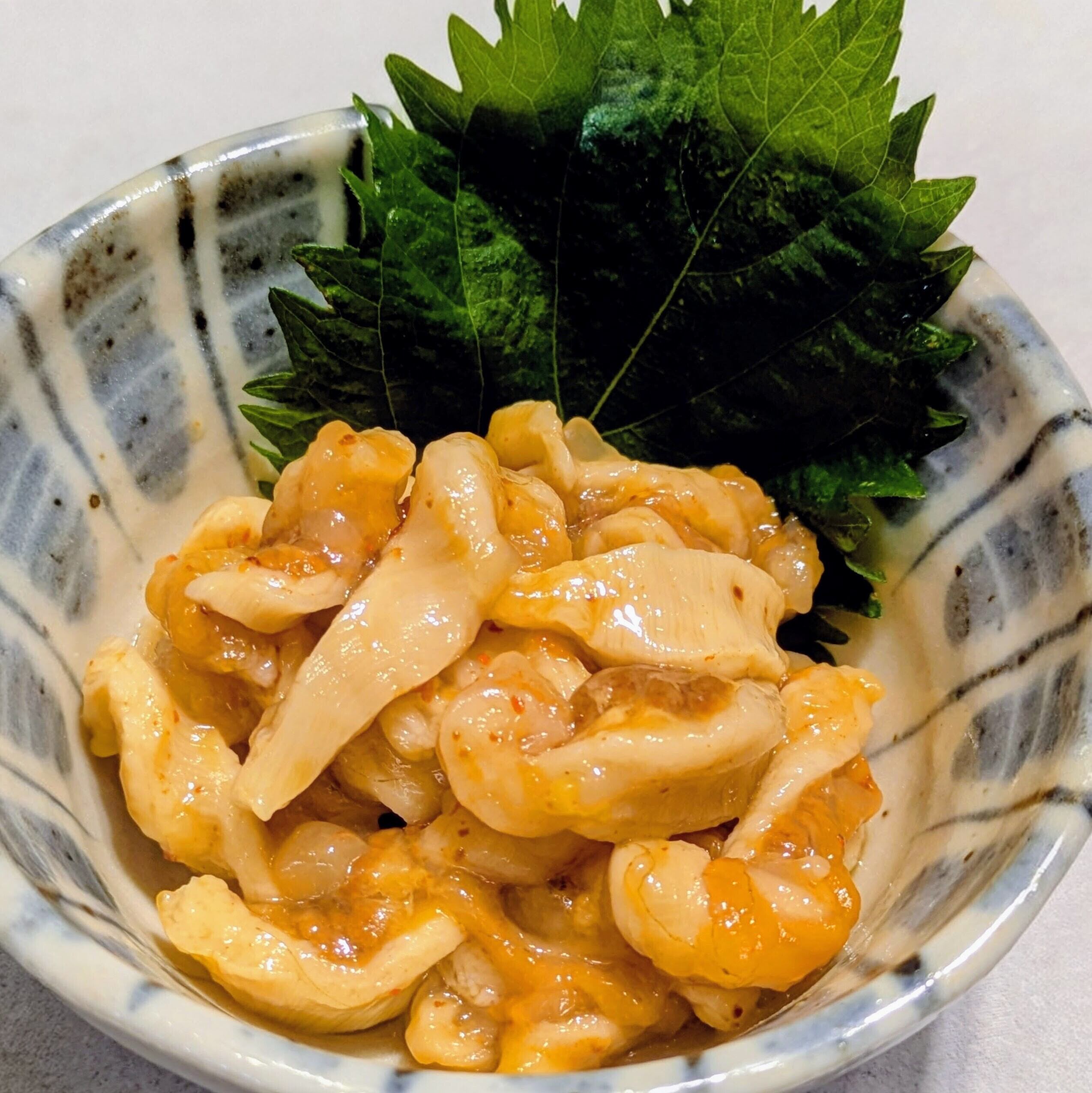 旬の季節、7月〜9月に水揚げされた、まるまると太った天然ほやを、塩辛仕立てにしてあります。